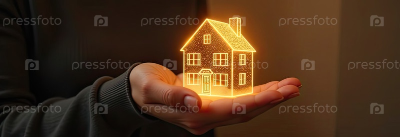 Золото светящийся символ уютного дома В ладонях рук с золотым блеском. Недвижимость, риэлтор, ипотека, страхование, бронирование, изоляция, мечта о собственном доме. ИИ генерируется