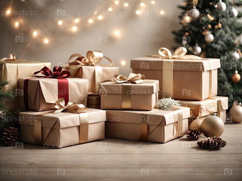 Рождественский фон с подарочными коробками с луками в нейтральных тонах естественного эко-стиля, боке и фейри-светом, рождественская елка во внутреннем интерьере дома. праздничное настроение Рождество и Новый год, открытка, созданный ИИ