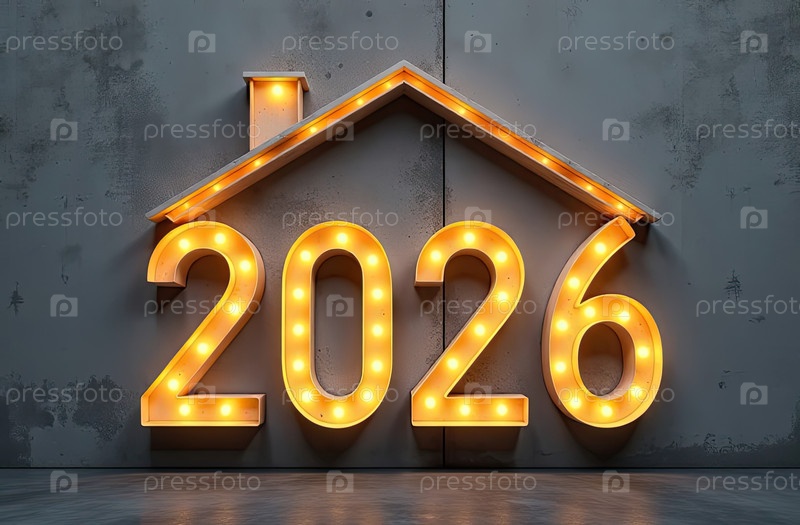Прозрачное золото светящиеся номера 2026 под крышей дома на сером бетонном фоне с золотым блеском. недвижимость, риэлтор, ипотека, страхование, бронирование. ИИ генерируется