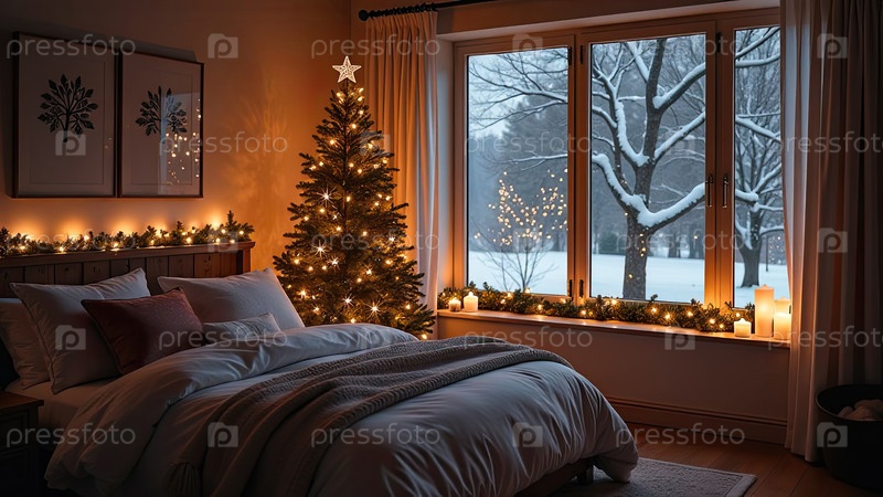 Уютная спальня с кроватью у окна с рождественским декором и елкой, теплыми гирляндами света и свечами - вид изнутри зимой и снегом. Отпразднуйте Рождество и Новый год, рождественское настроение. ИИ генерируется