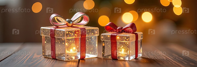 Золотая прозрачная светящаяся коробка для подарков на праздничном фоне с гирляндами боке с пространством для текста. Поздравления, открытки, фон Рождества и Нового года. ИИ генерируется