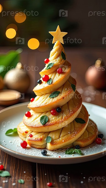 Вкусные выпечки печенье в виде рождественской елки из ягод, листьев мяты на праздничном новогодном столе. Рецепт и красивая презентация. Рождественский декор и установка стола. ИИ генерируется