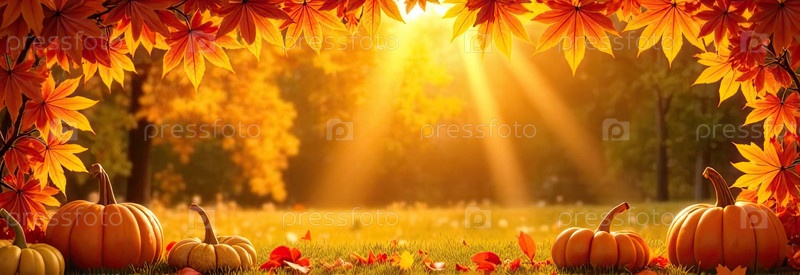 Рама украшена желтыми кленовыми листьями на осеннем фоне с тыквой в лучах солнца. баннер урожая и Хэллоуин, флаер с копировальным пространством. ИИ генерируется