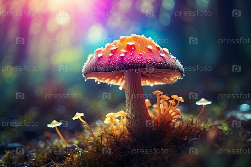 Светящаяся красная пара грибов, зачарованный лес, галлюциногенные споры, психоактивные фантазии, опасность зависимости от веществ
