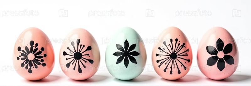 Внизу изображения пять яиц со свободным пространством сверху для текста, творческий цветочный черный рисунок на цветах-яйцах, белый фон. Пасхальный баннер с пробелом для текста. ИИ генерируется