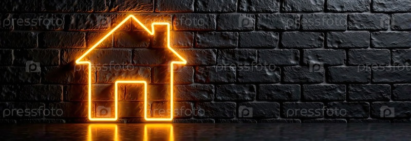 Прозрачное золото светящийся символ дома на фоне черной кирпичной стены с золотым блеском. недвижимость, риэлтор, ипотека, страхование, бронирование, строительство, изоляция, отопление. AI generated