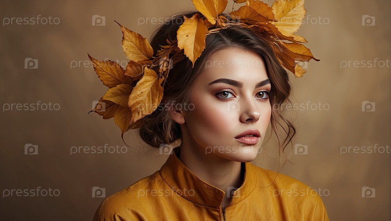 Белая женщина с блондинками и башмаком из коричневого листа, портрет осенней красоты, теплая сезонная элегантность, стиль осени
