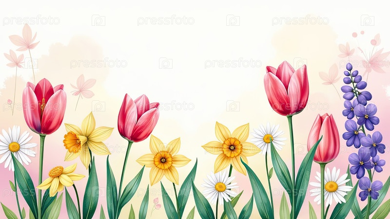 Рамка акварели с весенними цветами тюльпаны, нарциссы-Весенняя открытка со свободным местом для текста на 8 марта, женский день, Пасху