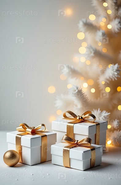 Рождественский фон с белыми коробками для подарков со золотыми лучами, светящимся боке и блеском. Праздничное настроение Карта на Рождество и Новый год с копировальным пространством. ИИ генерируется
