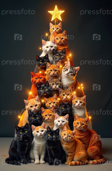 Рождественская елка из кошек сделанная на черном фоне, многоцветные сотни кошек складываются в форме высокой рождественской елки с золотыми светящимися гирляндными огнями