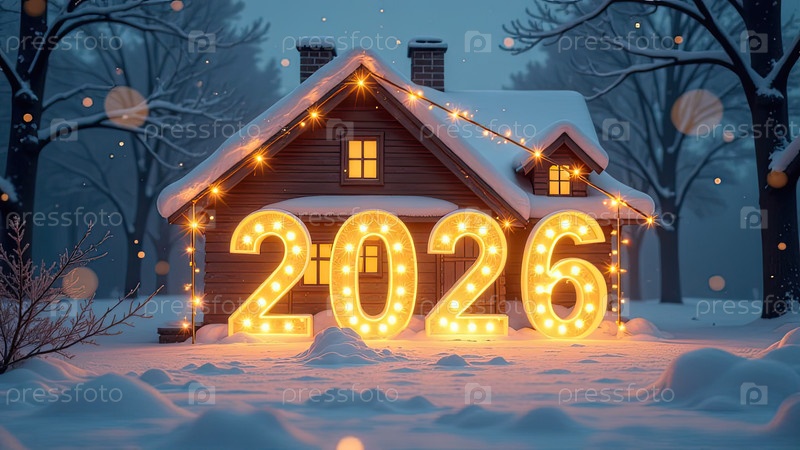 Прозрачное золото светящиеся числа 2026 под крышей дома на снежном фоне Нового года с золотым блеском