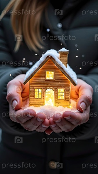 Золото светящийся символ уютного дома на снегу В ладонях рук с золотым блеском. Недвижимость, риэлтор, ипотека, страхование, бронирование, зимовка, изоляция, отопление. ИИ генерируется
