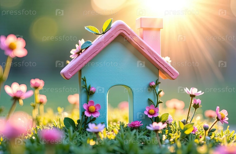 Крошечный дом в солнечных лучах, украшен весенними пастельными цветами на весеннем пастельно-синем фоне. недвижимость, риэлтор, ипотека, страхование, бронирование, строительство, изоляция. ИИ генерируется