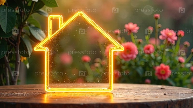 Прозрачное золото светящийся символ дома стол с весенним цветущим солнечным фоном. недвижимость, риэлторская деятельность, ипотека, страхование, бронирование, строительство, изоляция. AI generated