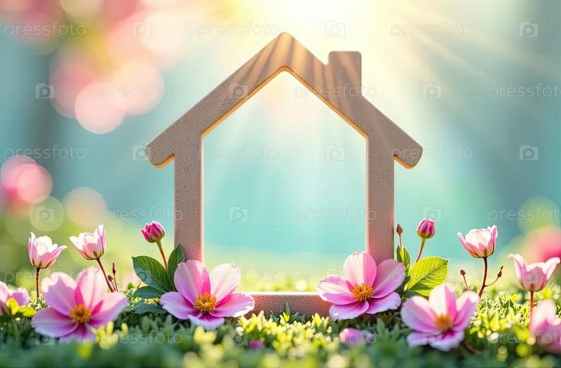 Домашняя декоративная рама в солнечных лучах, украшенная весенними пастельными цветами на весенне-синем фоне. недвижимость, риэлтор, ипотека, страхование, бронирование, строительство, изоляция. AI generated