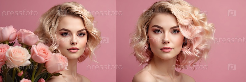 Блондинка с цветочной короной и мягким макияжем в стиле минималистской весны, портрет красоты на близком расстоянии, флористическая тема, нежная женственность, 8 марта, праздник цветков