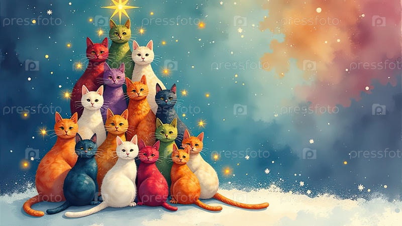 Акварельная рождественская елка из кошек, сделанная на праздничном фоне с блеском, многоцветные сотни кошек складываются в форме высокой рождественской елки с золотыми светящимися гирляндными огнями