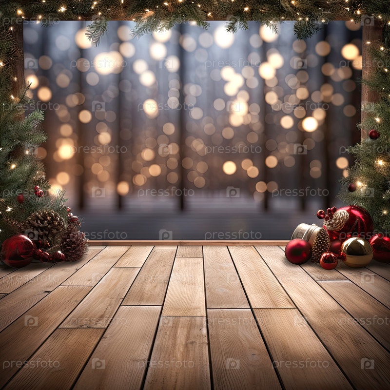 Пустой деревянный пол и стена для монтажа продуктового дисплея с рождественским декором, боке, секины и фейры. Копирование пространства, Рождество и Новый год. ИИ генерируется