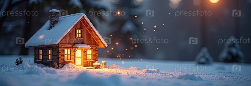 Прозрачное золото светящийся символ дома на снегу и заснеженном фоне с золотым блеском. недвижимость, риэлтор, ипотека, страхование, бронирование, зимовка, изоляция, отопление. ИИ генерируется