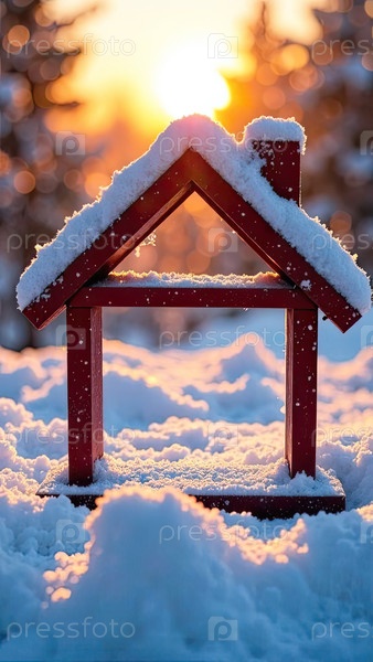 Уютный каркас крошечный дом на снегу и заснеженном фоне в солнечных лучах, с рождественским декором. недвижимость, риэлторская деятельность, ипотека, страхование, бронирование, зимовка, изоляция, отопление. ИИ генерируется