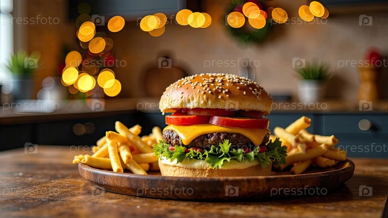 Вкусные бургеры и картофель фри в домашней кухне с рождественским декором, огнями гирлянды. доставка из ресторана быстрого питания, меню гамбургера домашнее приготовление на Новый год. ИИ генерируется;