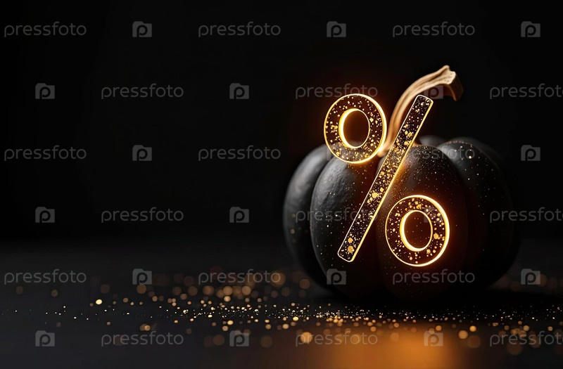 Золотой светящийся процентный знак с тыквой на черном фоне со свободным местом для текста. Осенние распродажи и скидки, баннер Harvest и Halloween, флаер с пространством для копирования. ИИ генерируется