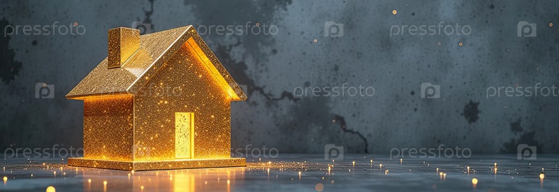 Прозрачное золото светящийся символ дома на сером бетонном фоне с золотым блеском. недвижимость, риэлтор, ипотека, страхование, бронирование, строительство, изоляция, отопление. ИИ генерируется