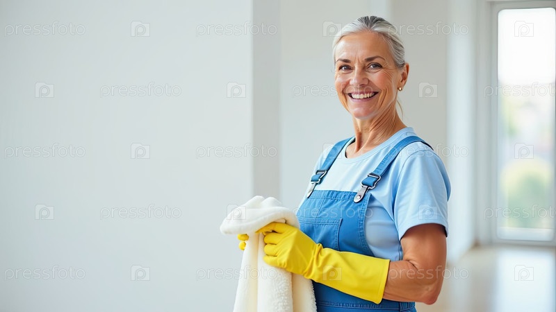 Портрет взрослой женщины в синем фартуке и желтых резиновых перчатках с тряпкой в руке у окна против белой стены, служба очистки окон, уборка дома