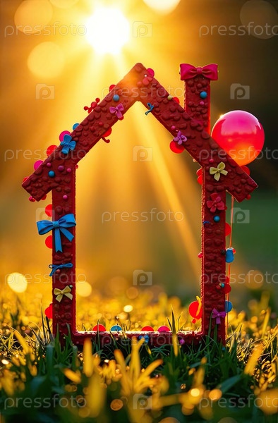 Крошечный каркасный праздничный дом в солнечных лучах, с воздушными шарами и луками, день рождения декор фоном на поле. недвижимость, дача, летний домик, ипотека, страхование, бронирование, строительство, изоляция. ИИ генерируется