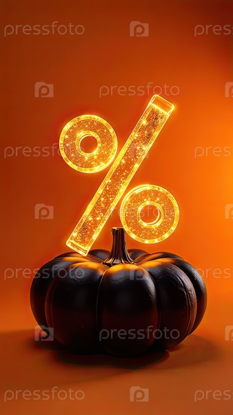 Золотой светящийся процентный знак с тыквой на оранжевом фоне со свободным местом для текста. Осенние распродажи и скидки, баннер Harvest и Halloween, флаер с пространством для копирования. ИИ генерируется