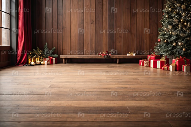 Пустой деревянный пол в коричневых и золотых тонах для отображения продукции со стеной во внутренней части комнаты, с рождественским декором. Копирование пространства, Рождество и Новый год. ИИ генерируется