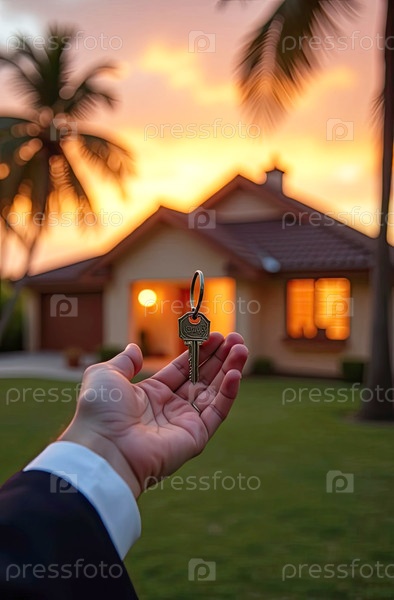 Рука риэлтора с ключами от дома для пляжного отдыха в жарких тропиках с пальмами. Резервации гостиниц, бронирование, переезд в новый дом, ипотека, аренда и покупка недвижимости. ИИ генерируется