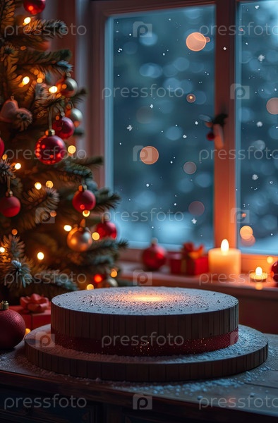 Пустая подиумная площадка для демонстрации продукта, дисплейный монтаж с рождественским декором, возле окна с елкой, снегом, свечами. Копирование пространства, Рождество и Новый год. ИИ генерируется