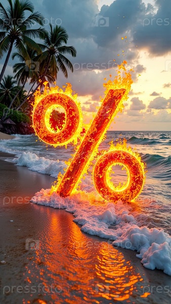 Огненный горящий знак процент на берегу моря с тропическими пальмами в свете солнца, фон заката океана. жаркая летняя распродажа и скидки, горящий тур-баннер, флаер. ИИ генерируется