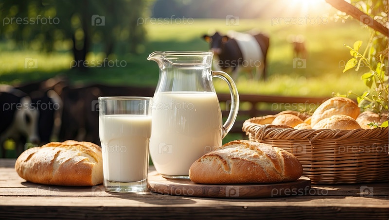 Свежее деревенское коровье молоко в кружке и белый ароматный хлеб и выпечка на столе на фоне луга, где пасутся коровы