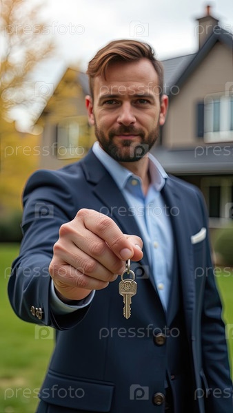 Недвижимость человек в костюме, держит ключ от дома в своей руке рядом с коттеджем - продажа, переезд, бронирование, проект коттеджа, ипотека, жилье и страхование недвижимости