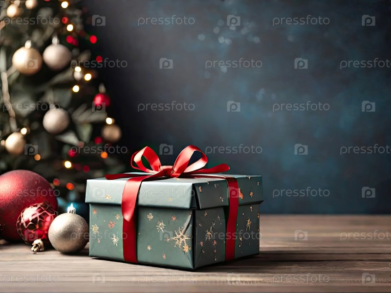 Рождественский фон с подарочной коробкой классических цветов с красными луками на деревянном полу и твердым фоном. Праздничное настроение Рождество и Новый год, копировальное пространство. ИИ генерируется
