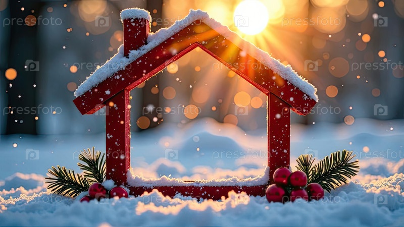 Уютный каркас крошечный дом на снегу и заснеженном фоне в солнечных лучах, с рождественским декором. недвижимость, риэлторская деятельность, ипотека, страхование, бронирование, зимовка, изоляция, отопление. ИИ генерируется