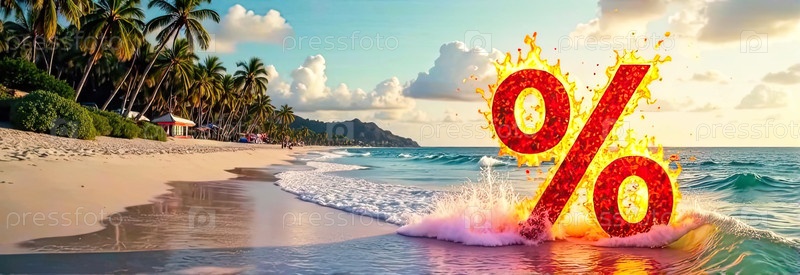 Огненный горящий знак процент на берегу моря с тропическими пальмами в свете солнца, фон заката океана. жаркая летняя распродажа и скидки, горящий тур-баннер, флаер. ИИ генерируется