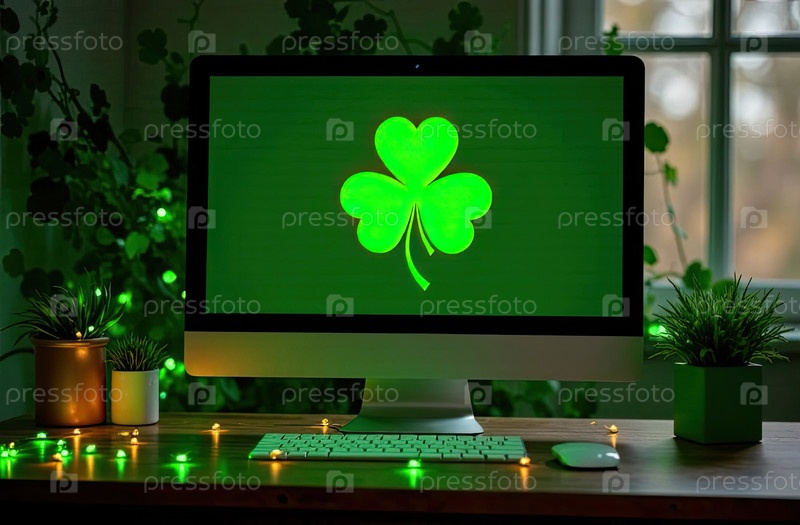 Ноутбук с зеленым клевером на экране в волшебном декоре ко Дню Святого Патрика. Сезонная дистанционная работа, интернет, рождественская карточка, шопинг, удача, зеленый дом. ИИ генерируется