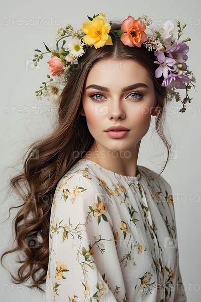 Белая женщина с цветочной короной и узорчатым весенним платьем, портрет весенней красавицы, свежее вдохновение, нежный цвет