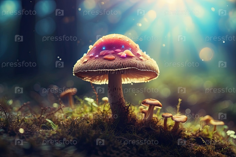 Одинокий магический гриб псилоцибина, светящийся в зачарованном лесу, галлюцинационные споры, символ зависимости и психоактивной фантазии