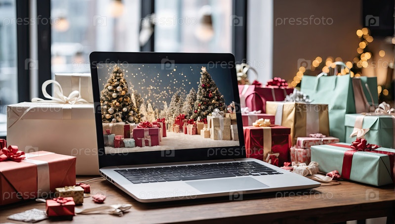 Ноутбук с рождественскими обоями на столе в офисе в торговом центре Рождественский декор с сумками, торговыми пакетами, посылками, Черной пятницей, Новым годом