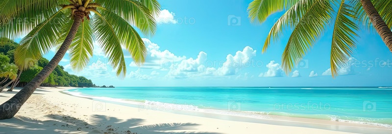 Панорама тропического райского пляжа с пальмами и белым песком на берегу океана. поездка к морю в теплом летнем климате, туристический отдых. ИИ генерируется