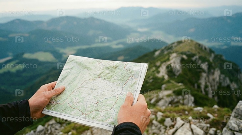Руки, держащие карту с живописным горным пейзажем, навигация, путешествия на открытом воздухе, планирование приключений, концепция исследования