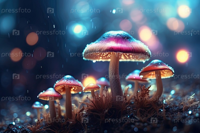 Семья светящихся грибов, волшебная группа псилоцибина, голубой лес, галлюцинационные фантазии, психоактивные споры, символ наркозависимости