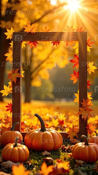 Рама украшена желтыми кленовыми листьями на осеннем фоне с тыквой в лучах солнца. баннер урожая и Хэллоуин, флаер с копировальным пространством. ИИ генерируется