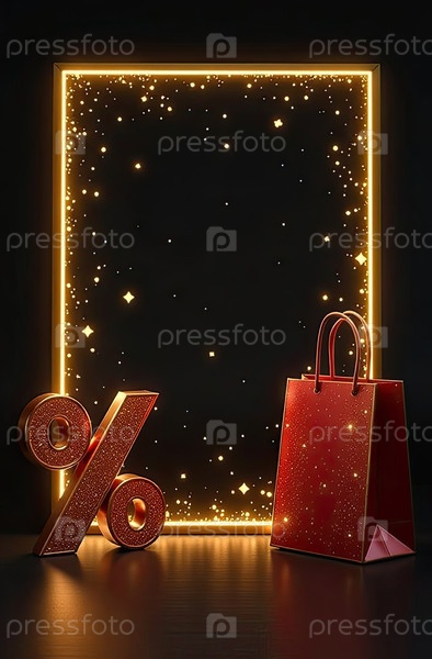 Неоновая светящаяся золотая рама с пространством для текста, процентный знак, сумки покупок на черном фоне. витрина магазина в Черную пятницу, распродажа, скидки, баннер, флаер. ИИ генерируется