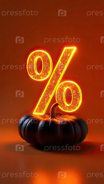 Золотой светящийся процентный знак с тыквой на оранжевом фоне со свободным местом для текста. Осенние распродажи и скидки, баннер Harvest и Halloween, флаер с пространством для копирования. ИИ генерируется