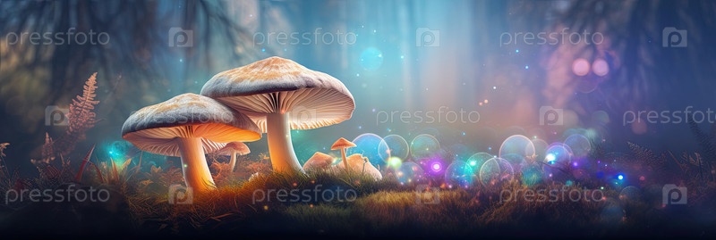 Дуэт волшебных грибов, светящиеся шапки, споры псилоцибина, ночная фантазия, символическая поездка с наркотиками, галлюцинационный риск и зависимость